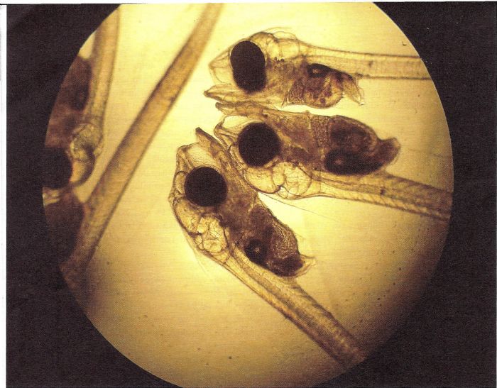 YUMURTA ÖZELLİKLERİ ve EMBRİYOLOJİK GELİŞİM ![]() ![]() Üst: Larva üretiminde kullanılan deniz suyunun yüksek basınçlı kum filtrelerinden geçirilerek temizlenmesi önemli bir konudur. Alt: Kuluçka üretim tesislerinde ısı düzenlenmesi (eşanjör sistemi) önemli bir konudur. ÇİPURALARDA PRELARVAL ve POSTLARVAR DÖNEM Çipura prelarvaları, yumurtadan çıktıklarında yaklaşık 2,6-2,S mm boydadırlar. Vitellüs kesesi çapları ise 0,9-1 mm' dir. Vitellüs kesesinin arka kısmında 0,2-0,22 mm çapında bir yağ damlası bulunur. Ağız ve anüs kapalıdır. Baş vücuda oranla küçük, gözler büyük ve pigmentsizdir. Pigmentasyon sarı ve siyah olup sarı pigmentler başta birkaç tane, anal ve yanlarda bir sıra olarak bulunur. Vitellüs kesesi baş kısmının altında, su geçirmez bir zar ile sıkışmıştır. Yüzgeçlerden yalnızca göğüs yüzgeçi bir taslak halinde önceleri yatay sonra dikey konumlu olarak 3. günde oluşur. Tek yüzgeçlerin yerine başın üstünde başlayan ve tüm vücudu sararak vitellüs kesesine kadar uzanan primordial yüzgeç bulunur. Bu yüzgeç larvanın yüzeyini genişletip su üstünde kalmasını ve 02 ihtiyacını karşılar. Denge organı olan otalitler gözlerin arkasında olup, burun delikleri tam gelişmemiştir. Sindirim sistemi düzensiz olmakla beraber, düz bir boru şeklindedir. Pankreas ve karaciğer oluşmuş fakat salgı bezleri ve lipit rezervleri mevcut değildir. Ağız açılmadan önce besin kesesinin çoğu absarbe edilir. Prelarvalarda boydaki toplam artış ile vitellüsün azalması çok yakından ilişkili olup sıcaklığın etkisi altındadır. Çabuk tüketilen vitellüs boyda ani artış yaratmasına rağmen lar vanın gelişimi için iyi değildir. Düşük sıcaklıkta vitellüs absorbsiyonunda boy geç uzamakla birlikte, toplam boyartışı fazla olmaktadır. Bu dönemde larvanın hareketinin az olması enerji tüketimini düşürür ve harcanan enerji larvanın organel gelişiminde kullanılır. Çok düşük sıcaklıklarda ise larva vücudunda deformasyonlar görülür. Larvada ağız ile anüsün açılması ve gözlerde renklenmenin başlaması ile postlarval evre başlar. Hava kesesi oluşumu ağız ve anüsün açılımından sonraki dördüncü günden itibaren gözlenebilir. Kesenin normal gelişiminin ilk saf- 'hası larva beş günlük ve 4 mm boyda iken meydana gelir. Eğer şişrrıe gerçek ÇİPURA LARVA YETİŞTİRME DÖNEMLERİ