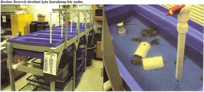 Yapay olarak yetiştirilmek istenen kerevitlerin yerleştirilecekleri sulara bırakılmadan önce bu sularda yayın, sudak ve turna balıkları gibi karnivor (etobur-et yiyen) balıkların fazla miktarlarda bulunmaması gerekir. Aksi taktirde ortama henüz intibak edemeyen ve kabuk değişimi devresinde müdafaası zayıflayan kerevitlerin bu yırtıcı balıklara yem olmaları tehlikeleri vardır Kerevitler doğal göl ve akarsularda yetiştirildiği gibi havuzlarda da yetiştirmek mümkündür. Bunun için oval beton havuzlar ve toprak havuzlar kullanılmaktadır. Istakozlara yeter miktarda saklanacak yer temin etmek için bu havuzların tabanına oluklu tuğla ve borular yerleştirilmektedir. Ayrıca toprak havuzların meyilli yerlerindeki otların altında doğal gizlenme yerleri hazırlanmaktadır. Bir aile işletmesi için muntazam gelir sağlayabilecek bir havuz örneği verilecek olursa bunun için 15 ın. boyunda 7 m. genişliğinde, 1,3 m. derinliğinde ve uzunluğu batıya doğru olmak üzere ve içinde birer uçları havuzun duvarlarına dayalı olmak şartıyla yeter miktarda künkler konmuş bir havuz inşaatı önerilmektedir. Bu konuda çok çeşitli uygulamalar vardır. Ülkemiz için yapay yetiştirmede en uygun kerevit cinsi olarak Astacus leptodactylus (göl Istakozu) ismiyle anılan ve bütün sularımızda bulunan kerevitler düşünülebilir. Yapayolarak kerevit yetiştirmede uygun olan diğer bir tür, her iklime kolaylıkla uyabilen ve çabucak intibak eden Oronectus limosus (Amerikan ıstakozu) adı ile tanımlanan kerevitlerdir. Bu tür kerevit birinci dünya savaşından sonra A.B.D.'den getirilerek milyonlarcası Almanya 'da Berlin civarında stokla- malarda kullanılmış ve başarılı sonuçlara ulaşılmıştır. Bundan başka tavsiye edilebilecek diğer bir tür kerevit Pacifastacus leniusculus (Ala Istakoz) adıyla belirtilen kerevittir. Bu tür kerevit 1960 sonları ile 1970 başlarında Kuzey Amerika'dan İsveç'e getirilmiş ve yapılan deneme ![]() ![]() Üst: Kerevit üretimi için kurulmuş bir ünite Alt : British Colombia da kerevit çiftliği. Yetiştirilen tür Pacifasticus leniusculus. Aynı işletmede kullanılan kerevit kasaları takriben 1 m3 hacimli olup bir kasada 1000 dolayında kerevit barındırılmaktadır. Arazi Sık ağaçlı araziler tercih edilmez. Kenarları sık çalılarla kaplı ve etrafı ağaçlı ise hasat güçleşir ve arzu edilen su bitkilerinin gelişmesi güçleşir. Dökülen yaprakların havuzda çürümesi oksijen azalmasına neden olur. Toprak yapısı bakımından her mevsimde su tutabilme özelliğine sahip olmalı, suların alçalma periyodu olan yaz aylarında havuzlar kuru olduğundan kerevitlerin gerek kendisi ve gerekse yumurtalarını korumak için kazdığı oyuklarda mutlaka su