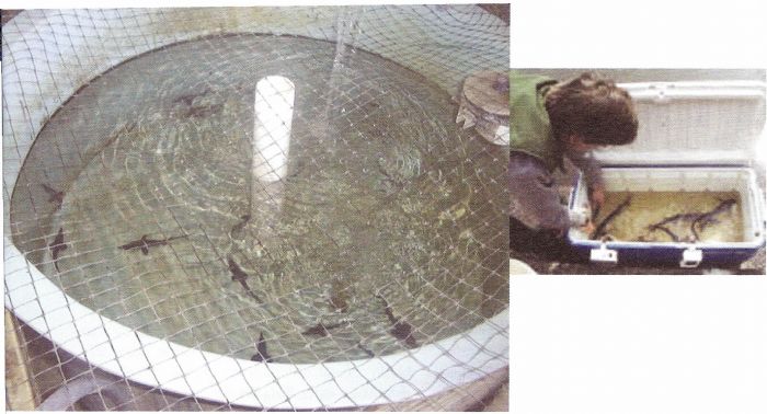 ![]() Kontrollu ortamda yetiştirilmiş mersin balıkları YAVRULARIN BAKIMI ve BESLENMESİ: Larvalar yumurtadan çıktıktan sonra çok hareketlidirler ve tipik renk dereceleri gösterirler. Sırt kısımlar siyaha kaçan kurşuni renkte, yumurta keseleri ise, beyazımsı renktedir. Kuluçka dönemi sonunda kayıp, genel olarak % 20-30 civarındadır. Yumurtadan çıkan larvalar, gergin bir tülbent kepçe ile alınır ve su dolu bir küvette toplanırlar. Daha sonra bu yavrular, belirli bir süre bakım ve beslemeye alındıkları yuvarlak beton havuzlara veya dikdörtgen büyük toprak havuzlara taşınırlar. Yumurtadan çıkan yavrular keseli durumdadırlar. İlk günlerde besinlerini bu keseden karşılarlar. Besin kesesi adı verilen bu kesenin absorbe edilmesi 5-10 gün içinde olur. Yavrular, keseli dönemlerinden sonra, ileride daha iyi gelişmelerini sağlamak amacıyla en az 2-3, en fazla 4-6 hafta daha beslenip, ondan sonra stok takviyesi amacıyla su kaynaklarına yerleştirilirler . YAVRULARIN 2-3 HAFTA BÜYÜTÜLMESİ: YAVRULARıN 4-6 HAFTA BÜYÜTÜLMESİ: Mersin yavruları yumuıtadan çıktıktan sonra hemen havuzlara alınmazlar. Önce aktif olarak besin alıncaya kadar (besin kesesinin absorbsiyonuna kadar) havuzun bir kenarında inşa edilmiş olan bir tesiste asılı vaziyette bulunan Şayet yavrular, kafeslere alınmadan dikdörtgen havuzlara alınacaklarsa, yuvarlak beton havuzlarda 2-3 hafta bakım ve beslenmeye alınmalı, ondan sonra havuza yerleştirilmelidir. Yumurtadan çıktıktan sonra direkt olarak yerleştirilirlerse, fazla miktarda kayıplar meydana gelir. Zira, yumurtadan çıkan larvalarda besin alımı 2-3 gün sonra başlar. Bu nedenle yavrular, beton havuzlarda bakım ve beslemeye alınmamışlarsa, yumurtadan çıkar çıkmaz önce 8-10 gün kadar kafes sandıklarda bulundurulmalı, ondan sonra havuza yerleştirilmelidir. Larvaların gelişmesi, bütün mersin türlerinde aynıdır. Baş, yumurtadan yeni çıkanlarda aşağıya eğiktir, ağız henüz teşekkül etmemiştir. Solungaç yaprakçıkları da eksik veya yoktur. Yüzgeç yerleri belirgin değildir. İlk 2 gün içinde baş ve besin kesesi iyice belirginleşir. Bundan sonra ağız yerinde bir yarık oluşur. Daha sonra solungaçlar teşekkül eder. Muhtemelen göğüs yüzgeçleri yumurtadan çıkışta mevcut iken, karın yüzgeçleri daha geç teşekkül eder. Besin kesesi yavaş yavaş küçülür, önce yumurta benzeri oval bir biçim alır ve 5-10 gün içinde tamamen absorbe edilir.