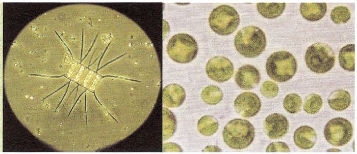 Kitaplar » Su Ürünleri Yetiştiriciliği » Mikro Alg Üretimi![]() Mikroalg kültüründe önemli oaln pek çok alg türü bulunmaktadır. Solda Chaetoceros sp. Sağda Chlorella sp. MİKROALG (FİTOPLANKTON) YETİŞTİRİCİLİĞİ Mikro alg yetiştiriciliği çeşitli amaçlarla ele alınan bir konudur. Özellikle çeşitli su canlılarının ilk dönemdeki beslenmesinde mikro alg- lerin çok büyük önemi vardır. Örneğin karides larvası üretiminde ilk başlangıç yemi olarak algler vazgeçilemeyecek bir gıda kaynağıdır. Bu nedenle dünyada milyarlarca yetiştirilen karides larvası üretimi için bu larvaları besleme amacıyla yoğun alg üretimi yapılır. Bunu yanında balık larvalarına canlı yem olarak kullanılan rotifer yetiştiriciliğinde de rotiferlere yem olarak alglerin üretimi de önemli bir konudur. Bunun yanında alglerin pek çok diğer kullanım alanları vardır. Bunlardan bazıları insan gıdası olarak kullanıla- bildiği gibi yan bir besleyici olarak hap şeklinde insanlara sunumu da söz konusudur. Kimya ve kozmetik dünyasında da çeşitli algler kullanılmakta ve bu amaçla yoğun yetiştirme çalışmaları uygulanmaktadır. Alg üretimi konusunda çok çeşitli besi yöntemleri ve formülleri geliştirilmiş olmakla beraber biz konumuz kapsamında olan deniz balıkları larvası yetiştiriciliğinde kullanılan rotiferlerin beslenmesinde uygulanan mikro alg yetiştirme yöntemlerine değinerek konuyu aydınlatmaya çalışacağız. Daha geniş kapasitelerde yetiştirme söz konusu olduğunda uygulanacak yöntemler de genel olarak benzerdir. Bu nedenle bu konuda yeterli bilgiyi verebileceğimiz düşüncesi ile Tarım Bakanlığı'nın Karadeniz'de kalkan yetiştiriciliği kapsamında uyguladığı alg yetiştirme yöntemini tam açıklığı ile vererek konuyu ihtiyaç duyacaklara sunmaya gayret edeceğiz. Kuluçkahanelerde veya diğer amaçlarla yapılacak mikro alg üretimlerinde detayları çok güzel bir şekilde açıklanmış olan bu çalışmanın alg üretimi ile ilgilenenlere önemli bir yol gösterici olacağına inanıyorum. Diğer deniz balıkları kuluçkahanelerinde olduğu gibi, Kalkan balığı larva yetiştiriciliğinde de, fitoplankton üretimindeki amaçlar; rotiferlerin beslenmesi, rotifer ve artemia larvalarının besin değerini yükseltme amacıyla yapılan alg ile besleme çalışmaları, ayrıca larva tanklarında pestisit ve amonyak gibi zararlı maddelerin ortadan kaldırılması için alglerden yararlanma olarak sıralanabilir.