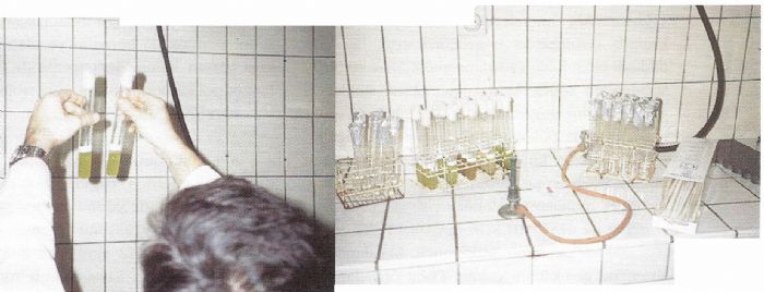 ![]() ![]() Üst:Alg üretiminde cam pipetler içerisinde başlayan üretim çalışmaları büyük tanklarda sone erer. Alt:küçük kaplarda devan eden alg üretim çalışmaları Proje başlangıcında Nannochloropsis sp. ve Phaeodactylum sp. türlerinin stok kültürleri ]aponya'dan getirilmiş ve Dunaliella sp., Cblorella spp., Chaetoceros sp. ve Skeletonema costatum türleri Türkiye sularından izole edilerek stok kültür oluşturulmuştur. Yapılan denemeler sonucu yoğun üretimde kullanılacak aday tür olarak Nannochloropsis sp. ve Phaeodactylum sp. seçilmiştir. Rotiferin küçük ölçekli hacimlerde üretim safhasında beslenmesi amacıyla Tetraselmis sp. kültürü de ele alınmıştır. Optimum sıcaklıklarda (200C ve 12.5°C) Nannochloropsis sp. ve Pbaeoductylum sp. türlerinin yoğunluğu ekimden (inokülasyon) bir hafta sonra sırasıyla 20x106 ve 2x106 hücre/ml'ye ulaşır. Uygulanan alg kültür prosedürü iki aşamadan oluşur: Üretilen alg türü için uygun büyüme koşullarını sağlayabilmek amacıyla stok kültür odasının sıcaklığı klima ile 18-220C arasında tutulur. Fotoperiyot veya gün uzunluğu, doğal gün ışığı tipi (2000-3000 lüks) floresan lambalar kullanılarak 12 saat aydınlık ve 12 saat karanlık olacak şekilde kontrol edilir. Cam malzemeler bir gece boyunca fosfor içermeyen deterjanda tutulur, iyice fırçalanarak yıkanır ve daha herhangi bir deterjan kalıntısı kalmayacak şekilde iyice durulanır. Bu işlemden sonra malzemeler 0.1 N HCI'lik asit solüsyonunda yıkanır ve saf su ile durulanır. Daha sonra kurumak üzere tozsuz bir yere ağızları aşağı gele- Arzu edilmeyen organizmaların kontaminasyonunu önlemek için, kültür kapları kullanılmadan önce otoklav veya etüv kullanılarak steril edilmelidir. (Otoklavda sterilizasyon 2 atm basınç ve 121•C'de 15 dakika) Steril edilecek materyaller alüminyum folyo veya gazete kağıdı benzeri materyalle sarılarak otoklav içerisine tüm yüzeye buhar ulaşacak şekilde yerleştirilir. Kimyasal kontaminasyondan sakınmak için otoklavın su haznesinde saf su kullanılmalıdır. Sterilizasyon işlemi sırasında oluşan yüksek basınç sonucu oluşabilecek patlamalardan kaçınmak için kapların ağızları tam olarak kapatılmamalı hafif bir hava akımı sağlayacak boşluk bırakılmalı veya pamuk gibi malzemelerin üzeri alüminyum folyo ile kapatılarak hava girişi sağlanmalıdır. ![]() Alg örnekleristeril ortamda stoklanır ve gerektiğinde buradan alınan örnekler üzerinden çoğaltılır