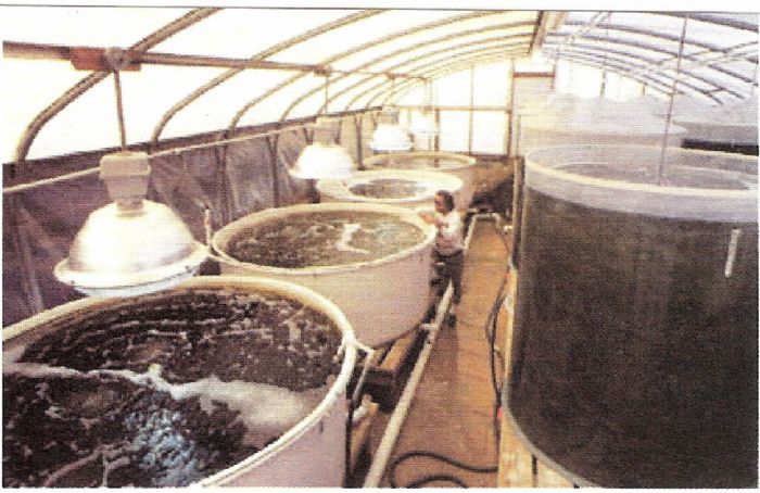Yoğun alg üretimi, bina dışına yerleştirilen 5-30 m3 hacme sahip fiberglass tanklarda yapılmaktadır. Fitoplankton gelişimini hızlandırmak için tanklar güneş ışınlarını direkt alabilecek şekilde yönleri doğudan batıya doğru olarak yerleştirilmelidir. Tanklar rotifer ve diğer protozoaların kuvvetli rüzgar veya diğer herhangi bir şekilde kontaminasyon riski göz önüne alınarak yerleştirilmelidir.