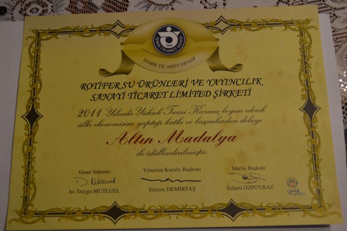 Özel » Hobilerim » Emeklilikten sonra nasıl tüccar oldum2011 yılı İzmir vergi rekortmenlerini altın madalya ile ödüllendirme töreni ve Ticaret Bakanı Hayati Yazıcı Emeklilikten sonra nasıl tüccar oldum Bu konuyu burada dile getirmeme gerek varmı bilmiyorum. Fakat tanrıya inancı yüksek bir kişi olarak iyi niyetle başlanan bir iş sonunda tanrının size çalışmalarınızın emeğini nasıl bahşettiğini gençlere anlatma bakımından yazmaya karara verdim. Bir fakülte dekanının emekli olduktan sonra bazı özel işler yapması doğaldır. Emekli olan bir çok Tıp doktorunun görevlerini özel sektörde devam ettirmelerini daima bir ülke hizmeti olarak görmüşümdür. Fakat bizim konumuzda emeklilikten sonra bir özel şirket kurma konusu pek yaygın değildir.Ama bana öyle bir konu nasip oldu ki kendimi bu iş içerisinde buldum Yıl 2001. Türrkiyede çok özlediğimiz balık yetiştiriciliği başlamış ve ilk olarak Yaşar Selçuk beyin kurmuş olduğu Pınar su ürünleri tesisleri ile çipura ve levrek yetiştiriciliği başlamıştır. Bu yıllarda levrek yavrusu üretiminde ilk canlı yem olarak Artemia yumurtası çok önemlidir. Bu canlının önemini konu ile ilgilenenler yakından bileceklerdir. (Bak bilgiler Artemia üretimi) Bu arada Amerikadan 4 misafir geldi. Ülkemizde artemia üretilip ütetilemeyeceği konusunda çalışmalar yapmak istiyorlardı. O sıralar dekan olduğum için fakultemize tahsis edilmiş olan dalyanda üretilip üretilemeyeceğini anlama amacı ile bu misafirleri dalyanımızı ve Çiğli tuzla alanlarını gezdirdim. Bu canlı halen Tuz üretim alanlarında bulunmakta ise de önemli yatırım gerektiğive yeterli üreme olmadığı gerekçesi ile pek uygun bulunmadı. Bu arada bu kişileri ABD leri Great Salt lake de artemia yumurtası üretiklerini öğrenmiştim. Fiyatını sorduğumda ülkemizde ki satış fiyatının yarı fiyatında ülkemizde satabileceklerini öğrendim.