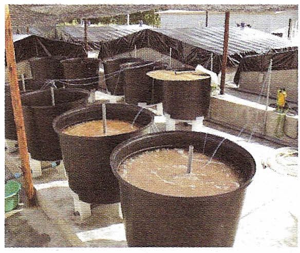 Damızlık karideslerin tutulacağı tankların asgari 4-5 m3 olması gerekir. En uygunu yuvarlak 15-20 tonluk tanklardır. Pek çok tür için tanklarda kum bulundurulması gerekmez. Fakat bazı üretimhaneler Penaeus japonicus türü için tank dibinde kum bulundurulmasını yararlı görmektedirler. Bu amaçla örneğin 5 m. çapı olan bir yuvarlak tankın orta kısmında 3 m. çapında ayrı bir daire içinde 10 cm. yükseklikte kum bulunduruması önerilebilir. Kumların pislenmemesi için özel önlemler almak gerekir. Bazı çalışmalarda kumun alt kısmından hava verilerek kumun kokuşma yapmamasına çalışılır. Kum ile tank çevresi arasında kalan 1 m. boşluk ise yemlenme ve karideslerin serbest gezeceği 'yer olarak ayrılır. Tanklar eğer içeride tutuluyor ise aydınlatma gerekir. Aydınlatma 100-200 lüks ışık verebilecek florosan lambalarla yapılabilir. Dış havuzlarda damızlık stoklanacak ise havuzun %20'sinin örtülmesi yararlı olur. Yumurtlama için fotoperiod çok önemlidir. Penaeus stylirostris türü üze- rinde yapılan bir çalışmada 14 saat ışık verme ve 10 saat karanlıkta bırakmanın yumurtaların gelişmesi ve yumurtlama bakımından çok uygun olduğu saptanmıştır. Karideslerde çıftleşme ve yumurtlama genellikle karanlıkta olur. El altında tutulan karideslerden de başarılı bir şekilde yumurta alabilmek için sıcaklığın 24-31°C, tuzluluğun ise %0 26-36 arasında olması gerekir. Bu dönemde besleme de önemli bir konudur. Özellikle yumurtaların gelişmesi için bazı yağ asitlerinin gerekli olduğu saptanmıştır. Karidesler bu yağ asitlerini doymuş yağ asitlerinden sentezleyemezler. Bu nedenle beslemede doymamiş uzun zincirli yağ asitlerinin bulunması istenir. Uzun zincirli yağ asitleri yapay yemlerde bozulduğundan, damızlık olacak karideslerin uzun zincirli yağ asitlerini içeren taze balık, teke, midye vs. gibi deniz canlısı etleri ile beslenmeleri yararlı olur. Günlük verilen et oranının toplam canlı ağırlığının %5'i kadar olması gerekir. Su sıcaklığı düşük ise bu oranın azaltılması gerekir. Yemlemede yapay yem kullanılıyor ise günde 4 kez yemlerne yapılmalıdır. Balık eti gibi yaş yemlerin akşam verilmesi ve sabahleyin artık yemlerin mutlaka toplanarak atılması uygundur. ![]() ![]() ![]() Üst : İtalya da yetiştiricilik yolu ile elde karidesler ve üretim alanı (Penaeus japonicus) Orta : Tayland da karides üretim havuzları Alt: : Puket' te karides çiftliği ve yoğun havalandırma Damızlık havuzlarında su kalitesi çok önemlidir. Suyun mümkün olduğu kadar mevcut deniz suyu temizliğinde tutulabilmesi hedeflenmelidir. Günde tank suyunun 2-3 kez değişmesi yeterli olabilir. Bazı araştırıcılar tank suyunun çok az bulanık olmasının yararlı olduğunu belirtmekte ise de bu konu ispatlanmış değildir ve en iyisi temiz sudur. El altında tutulan karideslerin kolayca yumurtlamalarını sağlama amacı ile gözlerinin koparılma pratiği birçok çalışmada uygulanmıştır.Gerçekten yumurtlama mevsiminde karideslerin gözlerinin koparılması yumurtlamayı çabuklaştırmaktadır. Fakat yapılan çalışmalar; gözleri kopartılarak elde edilen larvalarda saptanan yaşama gücü ve canlılığın normal karideslerden elde edilen larvalara oranla daha az olduğunu