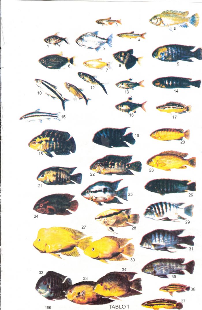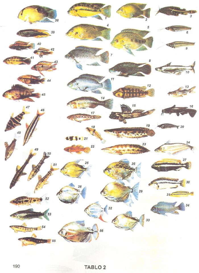 36.37.Julidochromis ornatus ![]() TABLO: 2 1.4. Tilapia thalloni, 2. Tilapia heudeloti, 3.Acanthodoras spinosissimus, 5. Tilapia mariae, 6.9.Kryptopterus macrocephalus, 7.11. Tilapia aurea, 8. Tilapia mossambica, 10.Platytropius siamensis, 12. Tilapia stornsii, 13 .. Mystus vittatus, 14.Eleostris africana, 15.Periophthalmus barbarus, 16.lctalunus nebulosus, 17.Mogurnda mogurnda, 18.Gobius vaimosa, 19.0phicephalus obscurus, 20.Paraifia longififis, 21.Brachygobius xanthozona, 22.Stigmatogobius sadonundio, 23.0phicephalus africanus, 24.Schi/be mystus, 25.Catoprion mento, 26.29.Myloplus scultzei, 27.30.31.Pseudotropheus auratus, 28.Metynnis hypsouchen, 32.Myloplus arnoldi, 33.Myloplus roosevelti, 34.Pseudotropheus zebra, 35.Characidium fasciatum, 36.Aphyocharax rubropinnis, 37.Pseudotropheus zebra subspecies, 38.Aequidens maroni, 39.Apistogramma agassizi, 40.Apistogramma klausewitzi, 41.Apistogramma reitzigi, 42.Apistogramma kleei, 43.44.Apistogramma ornatipinnis, 45.Apistogramma pleurotaenia, 46.Anostomus anostomus, 47.Abramites microcephalus, 48.Chi/odus puctatus, 49.Laemolyta taeniata, 50.51.Laemolyta taeniata subspecies, 52.54.Characidium fasciatum, 53.Leporinus agassizi, 55.Leporinus megalepis, 56.Mylosoma duriventris, |