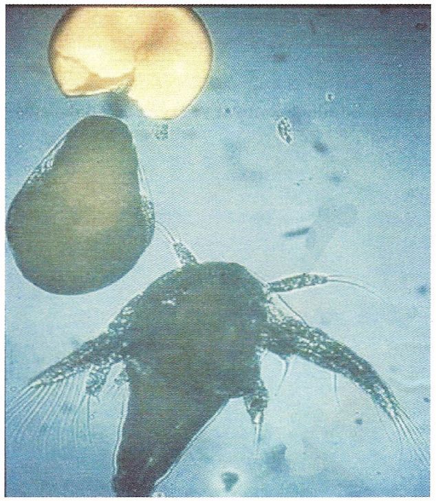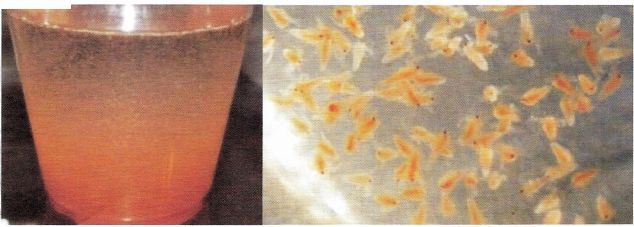 (Bottom): Artemia larvae that have just hatched. As can be seen in the picture to the left, dense larvae are obtained from one gram of eggs.