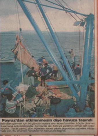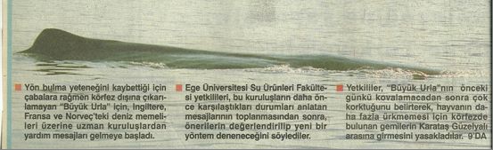 Aşağıda haberde görüleceği gibi bir balıkçı “Ben Urla’da 40 yıldır balık avlıyorum. Tahminim bu balık intihar etmek için gelmiş. Geçtiğimiz günlerde de sahile bir yunus balığı vurdu ve intihar etti.” Bu gazetede benim de bazı beyanlarıma yer verilmişti. Ayrıca her nereden gelecekse ve kimlerden oluşacaksa Avrupa’dan heyet geleceği belirtiliyordu. İngiltere’de bulunan uluslararası balina komisyonu ile merkezi İsviçre’de bulunan Dünya Doğal Hayatı Koruma Vakfı’ndan Çevre Bakanlığının yardım talep ettiği bildiriliyordu. Bu kuruluşların temsilcilerinden oluşan bir heyetin hemen Türkiye’ye geleceği belirtiliyordu